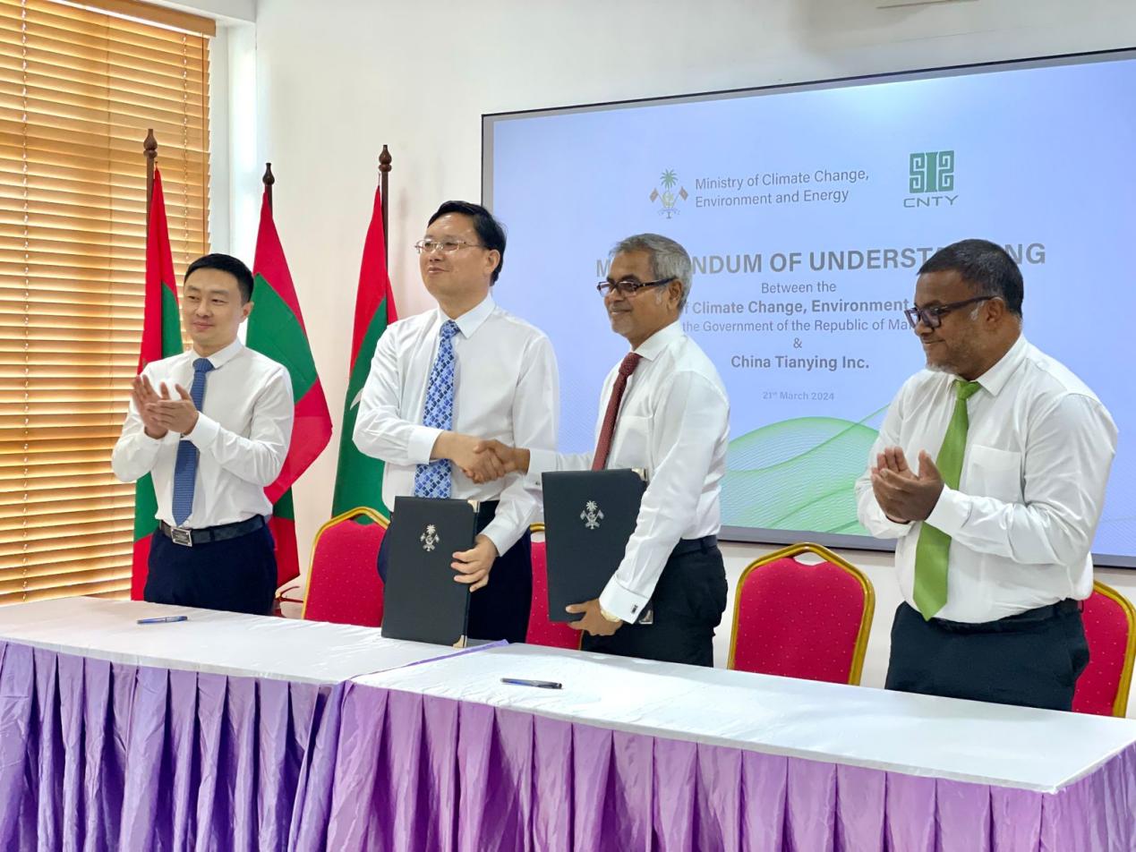 3月21日,中國天楹總裁曹德標同馬爾代夫氣候變化、環境與能源部長陶瑞克·易卜拉欣正式簽署合作備忘錄,雙方將努力協作,共同應對氣候變化,在可持續發展、能源轉型、環境保護、循環經濟以及低碳城市發展等議題上展開深度合作。