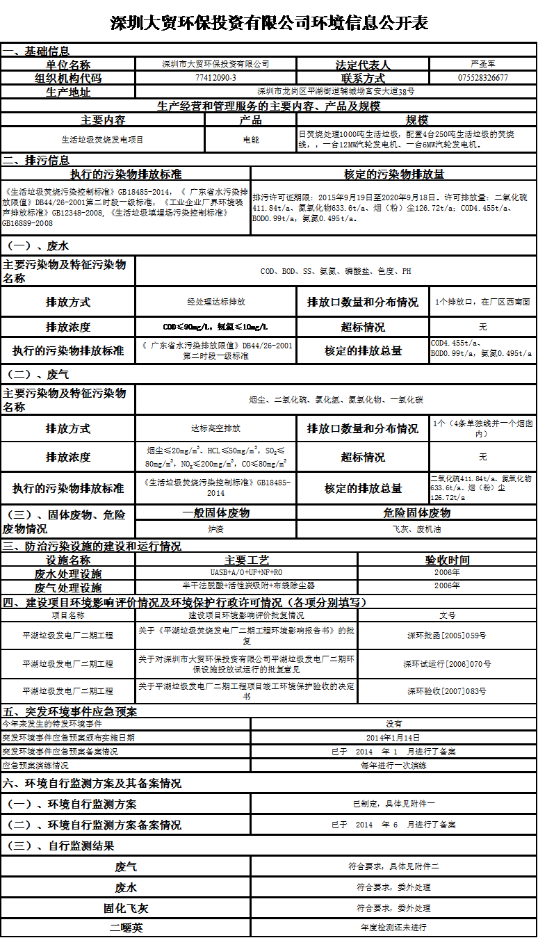 深圳市大貿環保投資有限公司2016年環境信息公開表