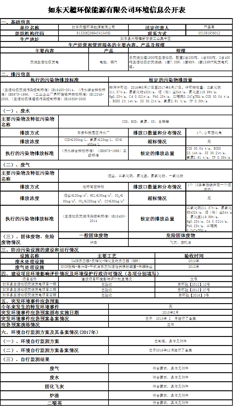 如東天楹環保能源有限公司2017上半年環境監測數據匯總